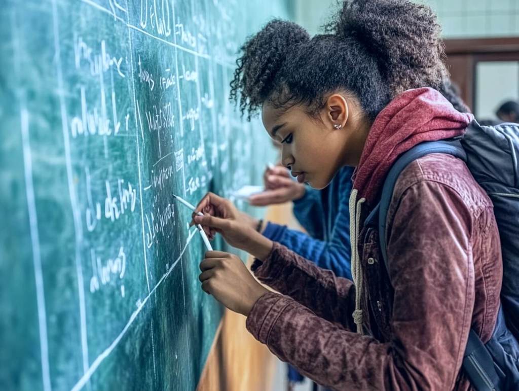 Alumnas escribiendo en la pizarra del aula mientras están en clase con los abrigos puestos. - Imagen: PF