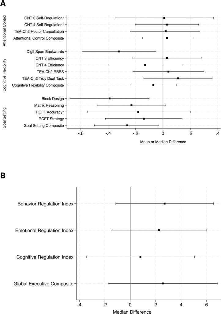 - Además, sus familias reportaron más problemas en el día a día relacionados con la organización, el control del comportamiento y la regulación emocional (RR = 1,86 en el índice global de función ejecutiva, p = 0,03).