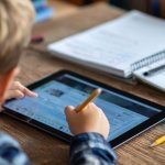 Un niño utiliza una tablet en clase junto a sus cuadernos, reflejando la convivencia entre lo digital y lo tradicional en la educación. Midjourney-RG