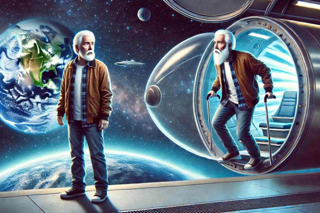 Aquí viene lo realmente alucinante. ¿Creías que un minuto dura lo mismo para todos? Einstein demostró que no. Piensa que escapas del sistema solar. Si tú te vas en una nave espacial que se mueve muy, muy rápido, y tu gemelo se queda en la Tierra… cuando regreses, tú serás más joven que él. No por magia, sino porque el tiempo para ti habrá pasado más lento.