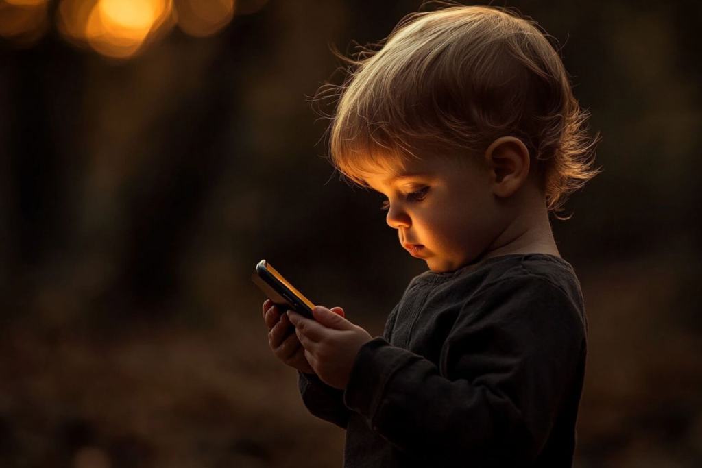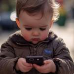 Sigue el debate del uso de pantallas y su impacto: ¿Influyen más los hábitos digitales aprendidos desde etapas tempranas o es más efectiva la prohibición? (Midjourney - RG) - Un bebé mirando el móvil