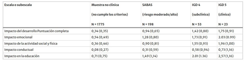 Tabla 4 Puntuaciones medias (y desviación estándar) de la escala de impacto del desarrollo por pregunta (máximo 4) en todos los grupos