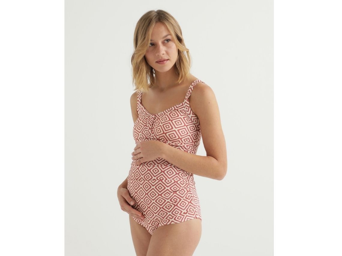 Bañador premamá efecto tye&dye de ajuste extraceñido con efecto moldeador en la cintura. Modelo con escote de corazón, tirantes ajustables y copas con relleno extraíble que moldean el busto y proporcionan una buena sujeción.