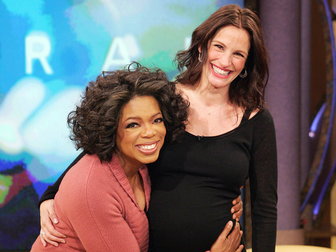 La novia de América estaba embarazada de gemelos durante el rodaje de Ocean´s Twelve. Los complementos del tipo bolsos, pañuelos o chaquetas en su versión maxi fueron suficientes para disimular el estado de Julia Roberts.