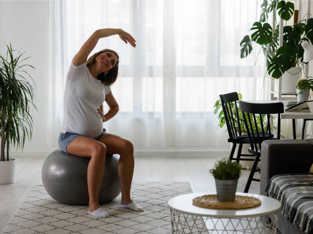 Veamos algunos ejercicios destinados a embarazadas para los que solo se necesita una pelota de pilates o pelota suiza, como también se conoce. Si dispones de ella, puedes usar también una colchoneta o esterilla para que te sea más cómodo realizar las posturas.