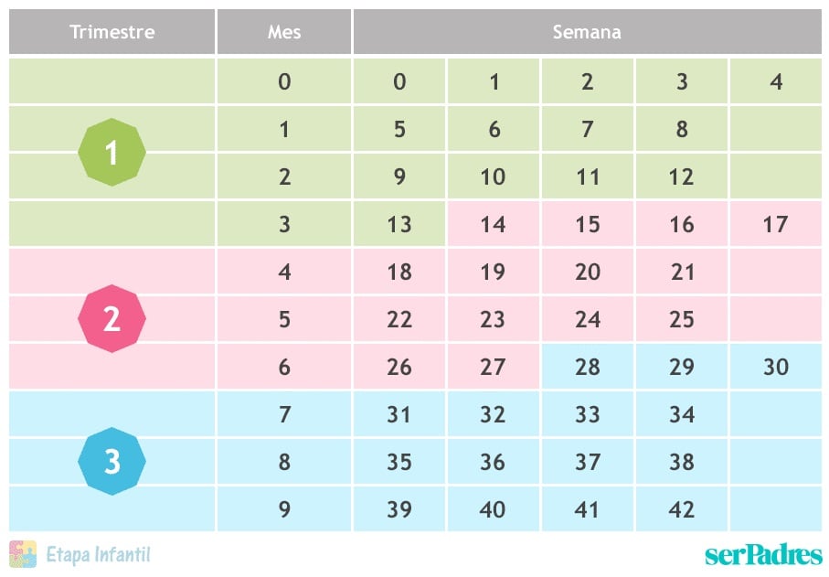 Quizá eso de pasar las semanas a meses te resulte un poco complicado o simplemente no te apetece estar contando todo el tiempo. Por esto, para que lo tengas aún más fácil, no te pierdas nuestra tabla de semanas, meses y trimestres en el embarazo para que puedas saber al instante en qué mes o trimestre te encuentras dependiendo de tu semana de embarazo.