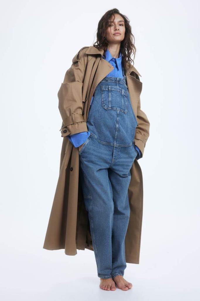 Peto tobillero en denim de algodón rígido con tirantes ajustables, botones en un lateral, bolsillos, cierre decorativo y perneras pitillo con trabilla funcional, de H&M (59,99 euros).