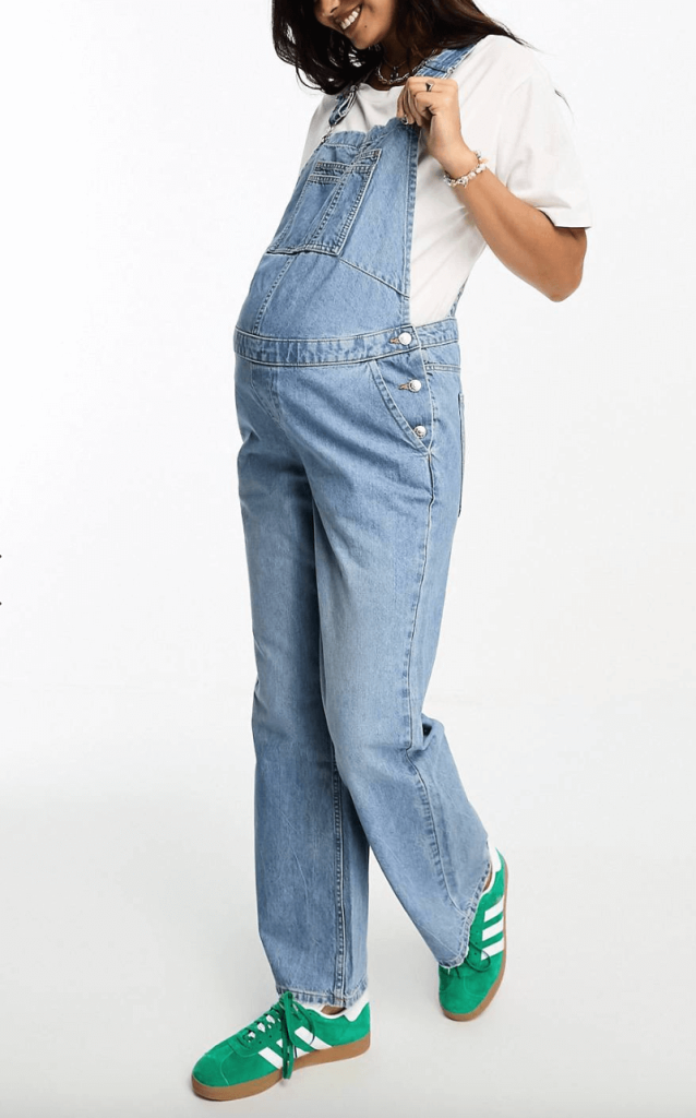 Peto clásico premamá, con tiras ajustables con hebillas, cinturilla elástica, laterales con botones, pernera ancha y corte estándar, de Asos Design (49,99 euros).