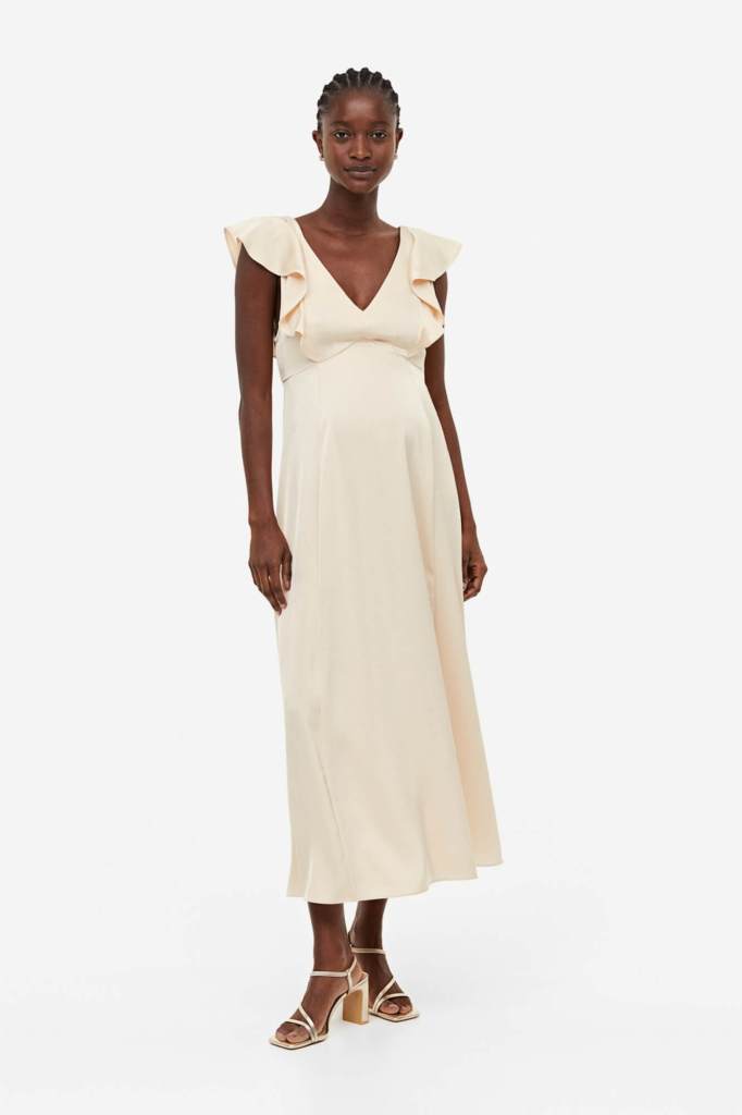 El estilo romántico de este diseño de H&M es lo más parecido a un sueño. Su costura elástica en la parte posterior de la cintura y su falda evasé hasta la rodilla lo convierten en una opción versátil, perfecto para todo tipo de fiestas y ocasiones especiales.Ya sea con sandalias o con botas, este vestido con volantes anchos en hombros y espalda, se convertirá en tu comodín estilístico para cualquier evento.