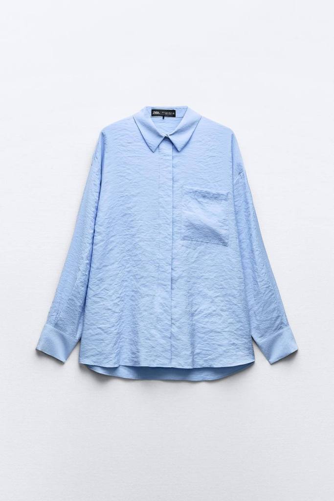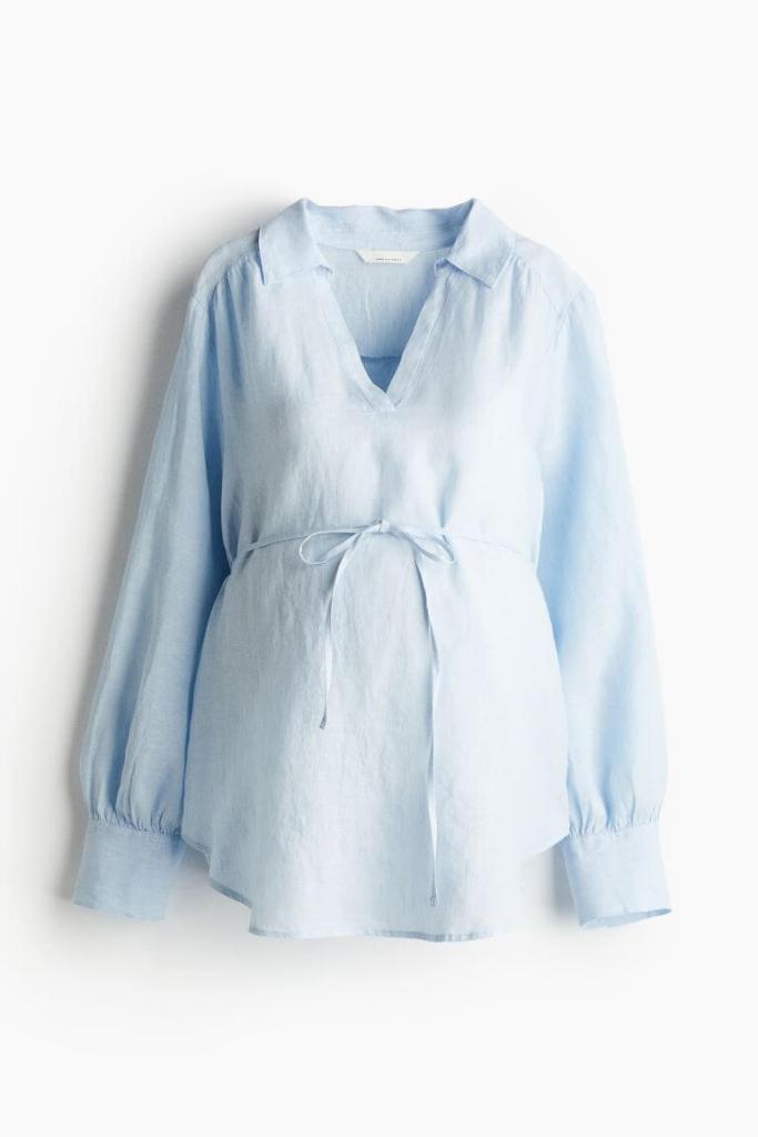 Camisa en lino vaporoso con cuello, escote en V y canesú con hombros fruncidos y pliegue de caja invertido en la espalda. Modelo de manga larga con hombros ligeramente caídos y puños anchos con abertura y botón. Cinturón de anudar fino, extraíble bajo el busto, bajo redondeado y espalda algo más larga, de H&M (32,99 euros).