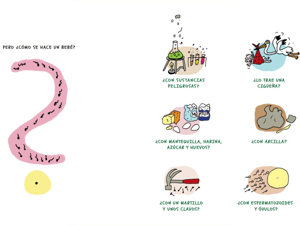 ¿Cómo se hace un bebé? es un libro que no entiende de tabúes y que no escatima en explicaciones: “Los adultos que están enamorados quieren estar lo más cerca posible el uno del otro. Se dan mimos. Se besan y se tocan. Para estar aún más cerca, se abrazan desnudos. Si son una mamá y un papá, meten el pene del papá en la vagina de la mamá. Así están lo más cerca posible”.