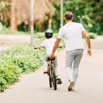 Una vez alcanzado este punto del aprendizaje, que será muy natural y progresivo si el niño tiene costumbre de utilizar la bici sin pedales, ya sí se pueden colocar los pedales y practicar -los ruedines déjalos como mucho puestos para las transiciones desde casa al lugar seguro para aprender y por el período de tiempo más breve posible, como hemos dicho antes-. El primer objetivo con ellos será aprender a impulsarse y enlazar la acción con la pedalada. Es mejor que sea el niño el que ponga la bici en marcha desde los pedales que empujarla, aunque podéis hacerlo las primeras veces sosteniéndola un poco. Mantén el asiento más bajo de lo normal para darle seguridad al crío, que vea que puede poner los pies en caso de inseguridad.