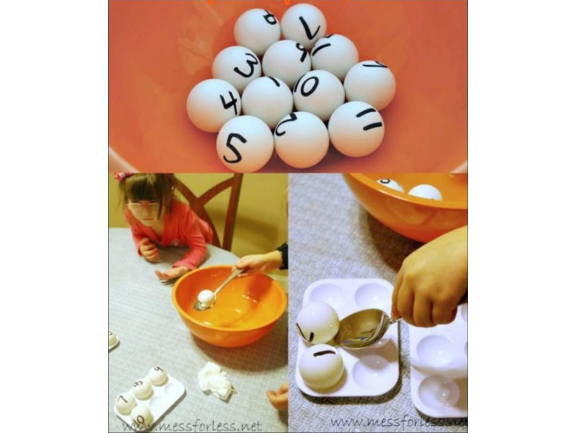 Utilizando la cuchara, el niño deberá ir pasando de una en una (y en orden) las pelotas del bol al cartón de huevos. Un juego muy bueno para aprender a contar y para potenciar la coordinación mano-ojo.