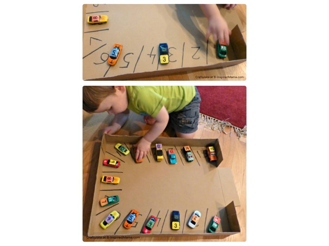 ¿Le encantan los coches de juguete? ¡Este es el juego indicado para el peque! Coloca una etiqueta en cada uno de sus coches (o en aquellos que queráis). Después, con cartón, elaborad un aparcamiento para los coches y escribid un número en cada plaza.