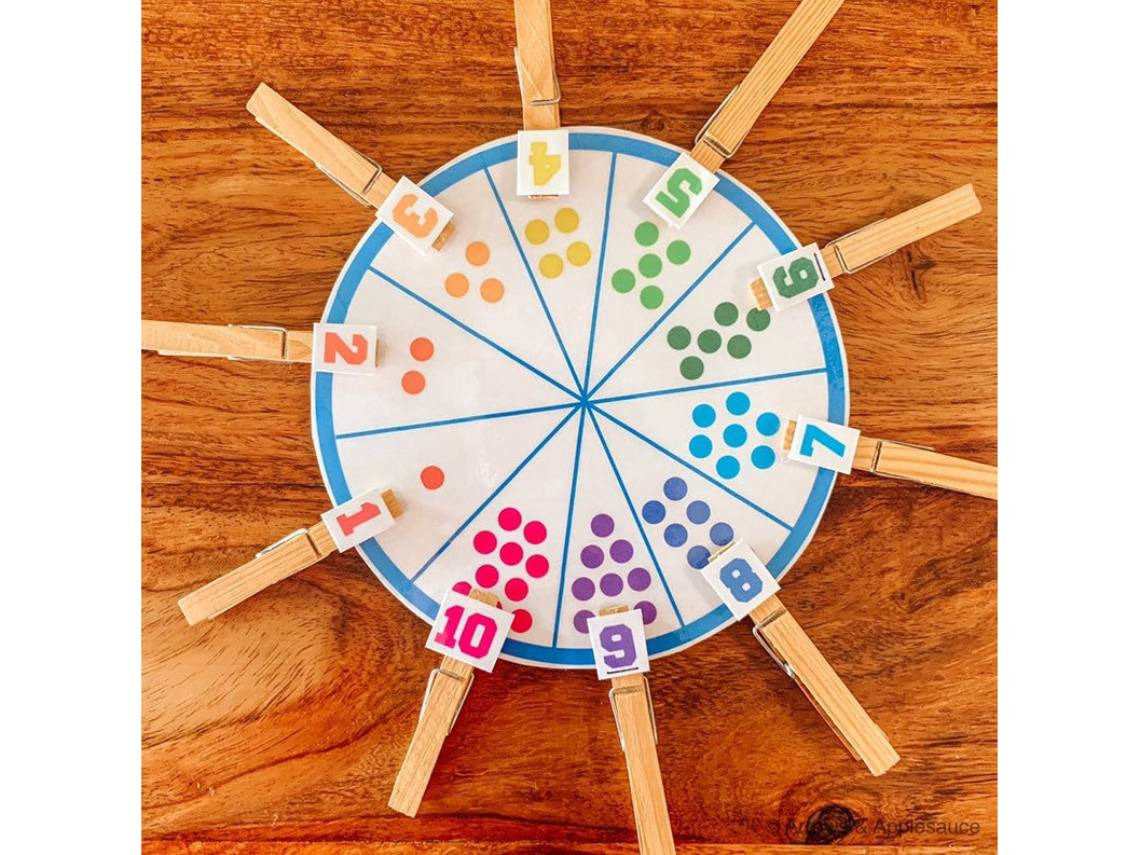 Se trata de una manualidad muy fácil: recorta un círculo de cartulina y divídelo en 10 partes. Asigna a cada una un número de puntos del 1 al 10. De la misma forma, escribe también en pinzas de ropa números del 1 al 10. El niño tendrá que colocar cada pinza en la franja que le corresponda.