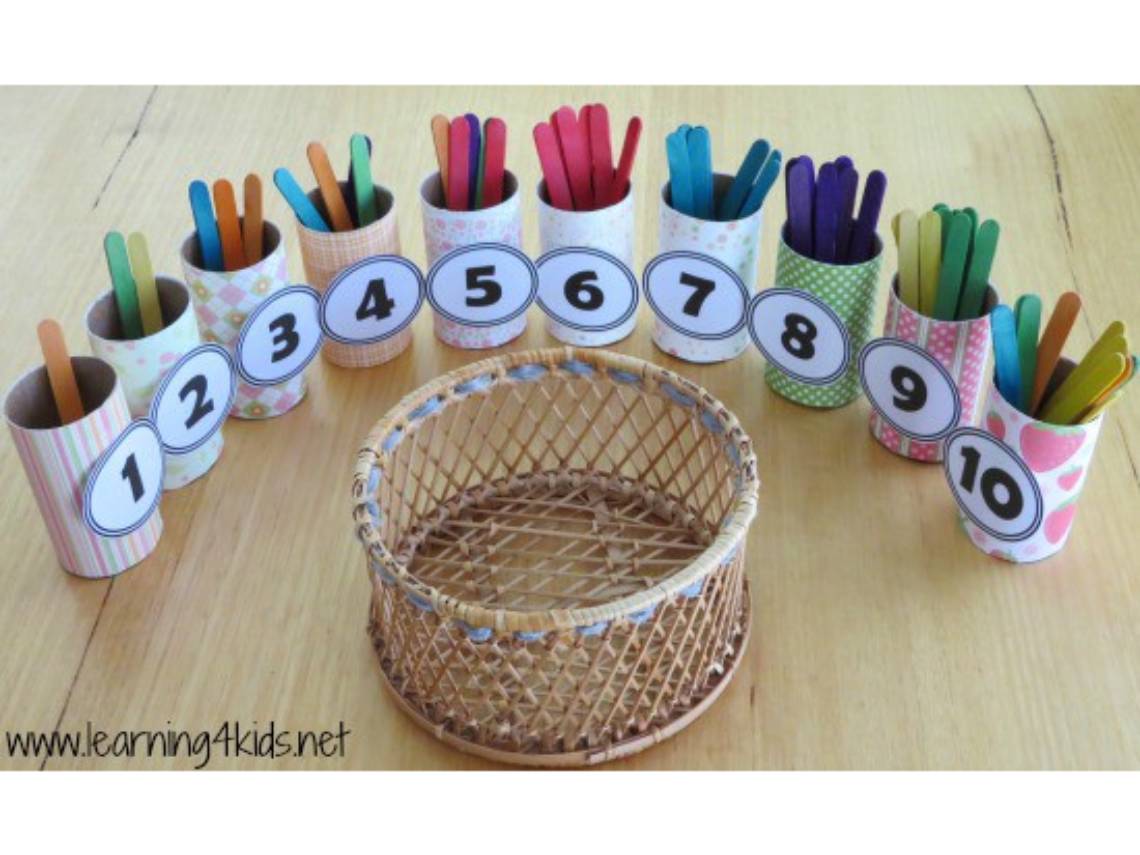 Tendréis que decorar todo ello: los palos los podéis pintar de colores y los tubitos los podéis forrar y ponerles un número a cada uno. El peque tendrá que ir colocando en cada tubo tantos palos como indique el número asignado.