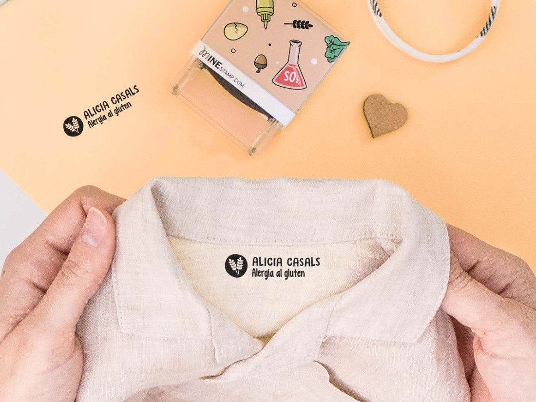 Además de con el nombre, puedes personalizar el sello en función de las alergias de tu hijo e incluso añadir la fotografía para que sea más claro. Este de Minestamp es un ejemplo del que disponen para alérgicos al gluten pero puedes elegir el que necesites para proteger el bienestar de tu pequeño.