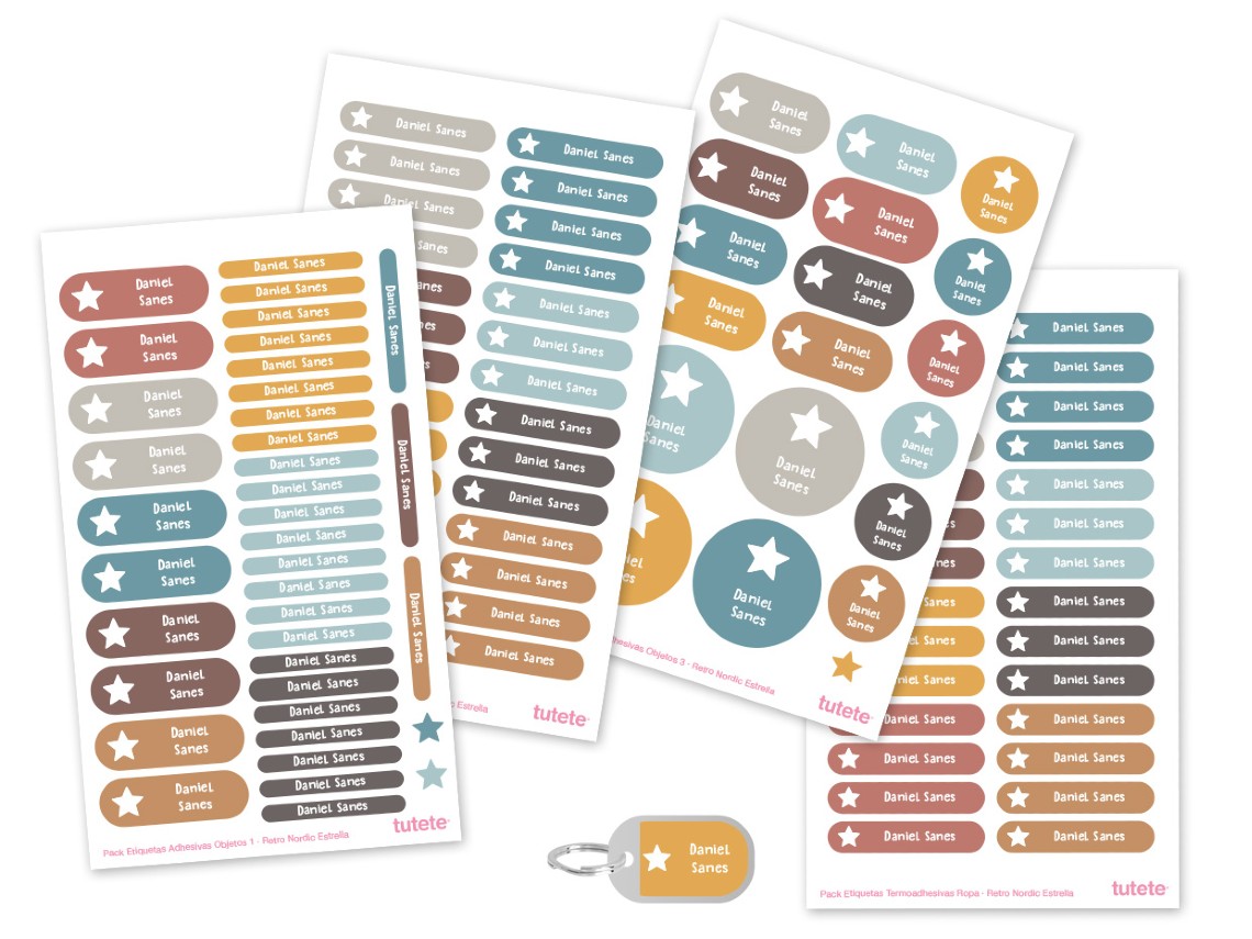 25 etiquetas termoadhesivas para la ropa, 30 pegatinas adhesivas personalizadas para identificar libros, cuadernos o hasta lápices; 12 pegatinas para los zapatos y hasta 1 llavero para colgar en la mochila o la bolsa de la merienda. Esto es todo lo que contiene este superpack que puedes encontrar en Tutete.
