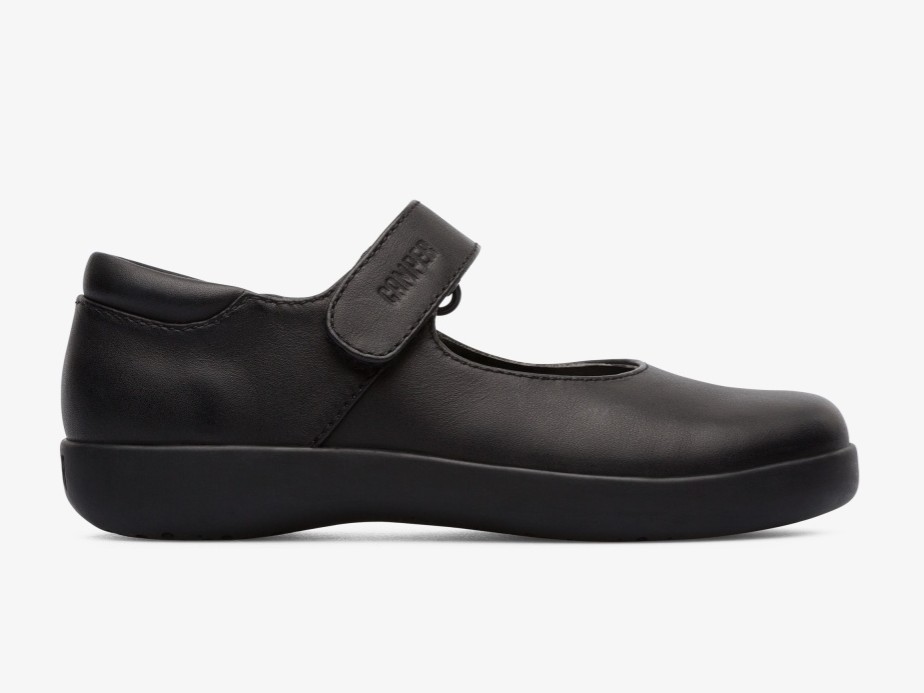 Esta bailarina de Camper en color negro para niña de piel con suela de goma ofrece un diseño de estilo clásico y atemporal fácil de poner y quitar.
