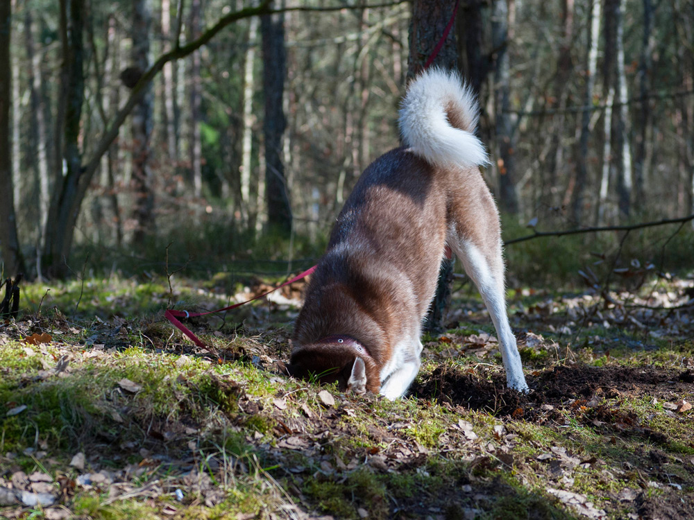 Algunos de los comportamientos “raros” tienen relación con su herencia de los lobos, y es que muchas de las cosas que hacen son por puro instinto, como enterrar objetos o comida, dar vueltas antes de tumbarse, echar arena después de haber hecho caca, llevarse su pienso a otro rincón de la casa para comer alejado...