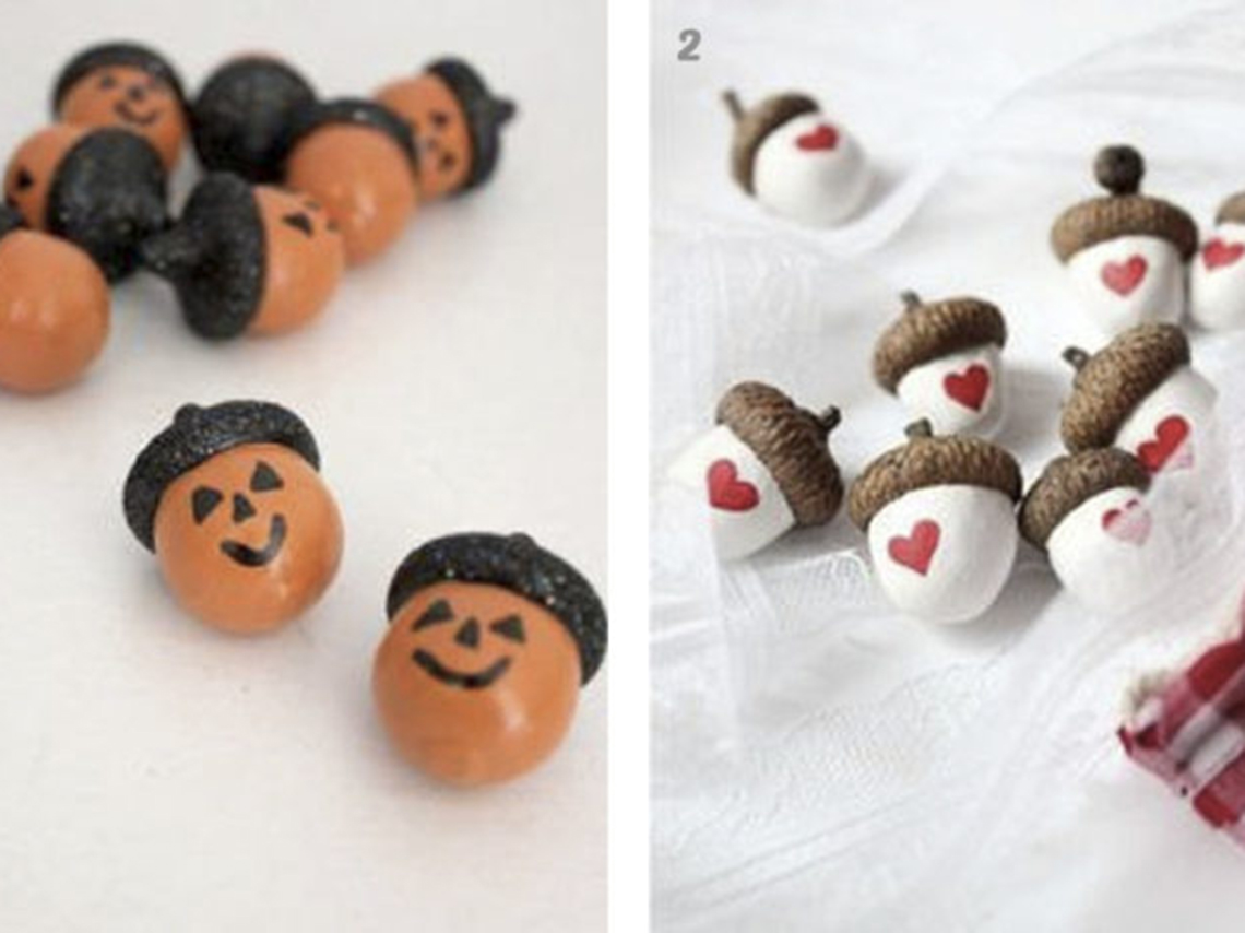Pasamos a otro fruto característico del otoño: la bellota. ¿Por qué no aprovechar su divertida forma para crear mini caritas? La parte superior nos servirá como sombrero para estas calabazas de Halloween o para darle un toque más tierno con corazones. Fuente: Pinterest