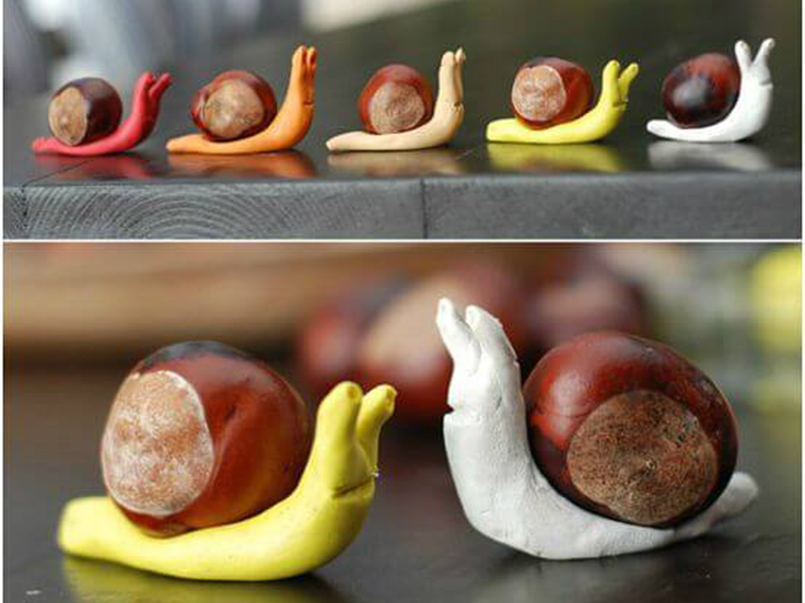 Si hay un olor que represente a esta estación es el de las castañas asadas. ¡Un momento! Antes de comeros todas, os proponemos darles un uso especial para crear estos caracoles tan monos. Solo necesitaréis un poco de arcilla o plastilina y un palillo para hacer los ojos y la boca. Fuente: Handfie
