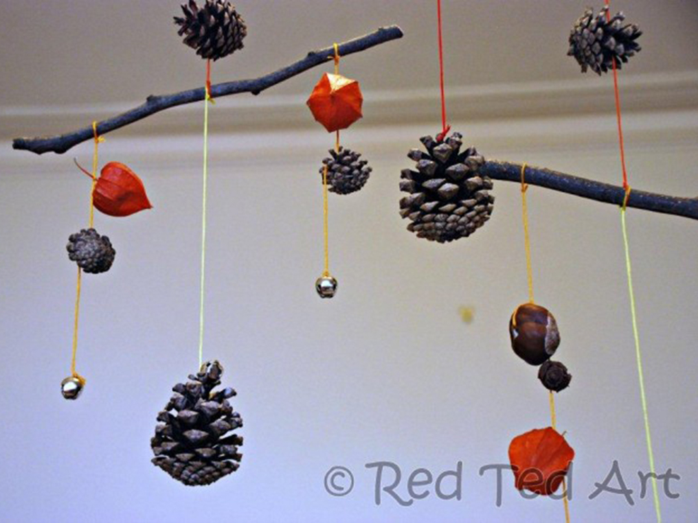 ¿Y si usamos todos los elementos anteriores? Seguro que a los niños les encantará irse a dormir mirando este móvil colgado del techo. Con unas ramitas y un poco de hilo podemos decorar la habitación de los peques. Vosotros decidís qué más añadir. ¿Castañas? ¿Hojas? ¿Piñas? Fuente: Redtedart