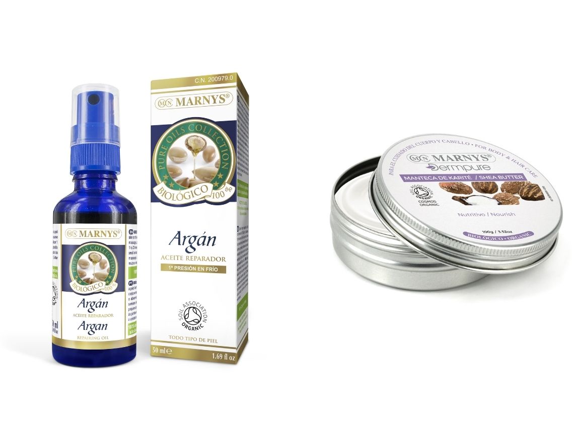 Os proponemos, por un lado, la manteca de karité de Marnys, para que hidrate bien toda su piel y, por otro, el aceite reparador de Argán de la misma marca, que hidrata, protege y suaviza la piel y el cabello.