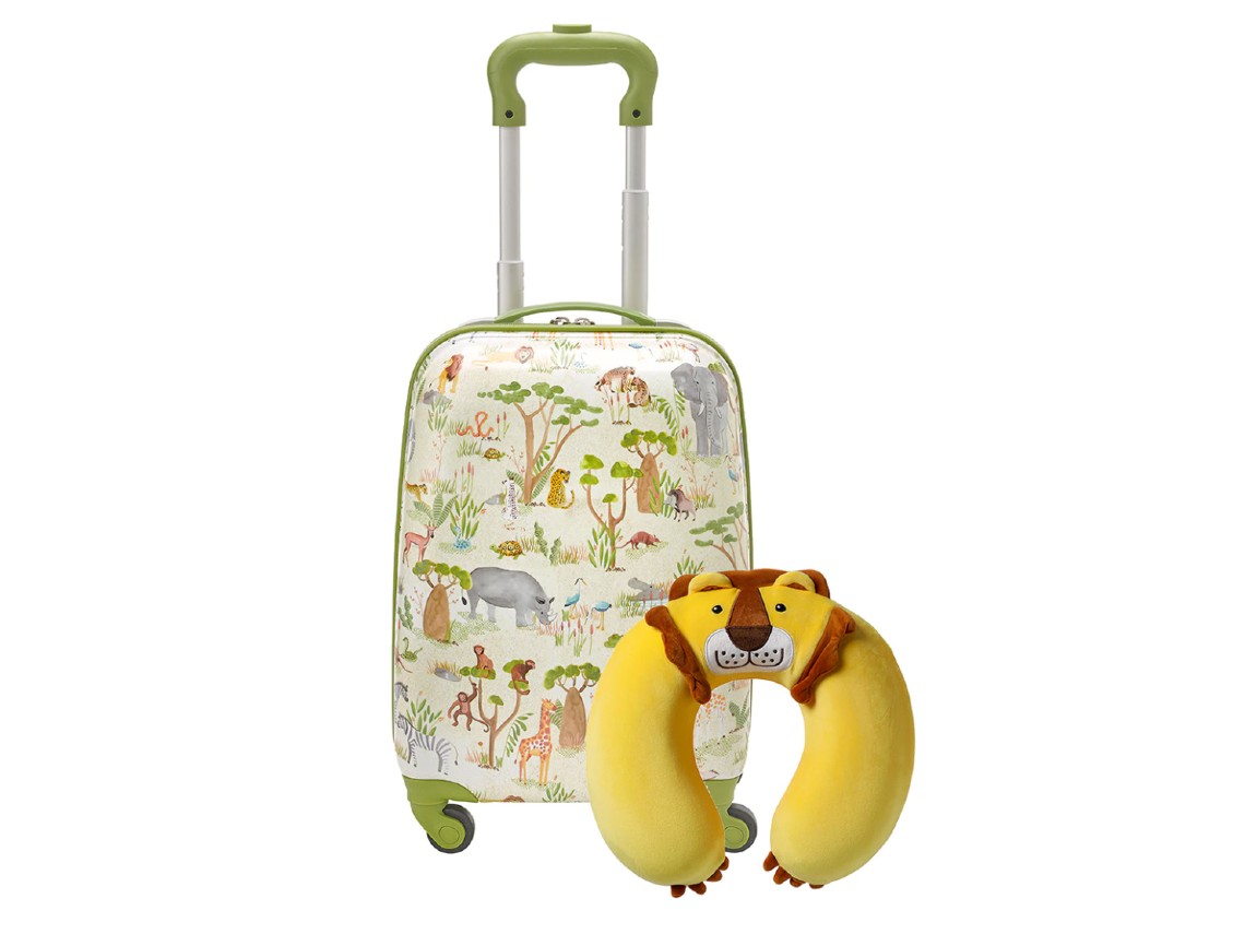 En El corte Inglés encontrarás este dúo de maleta rígida tamaño cabina con estampado de animales en la Savanna africana con un collarín con forma de cabeza de león, muy adaptable a la forma del cuello.Precio: 14,95 euros