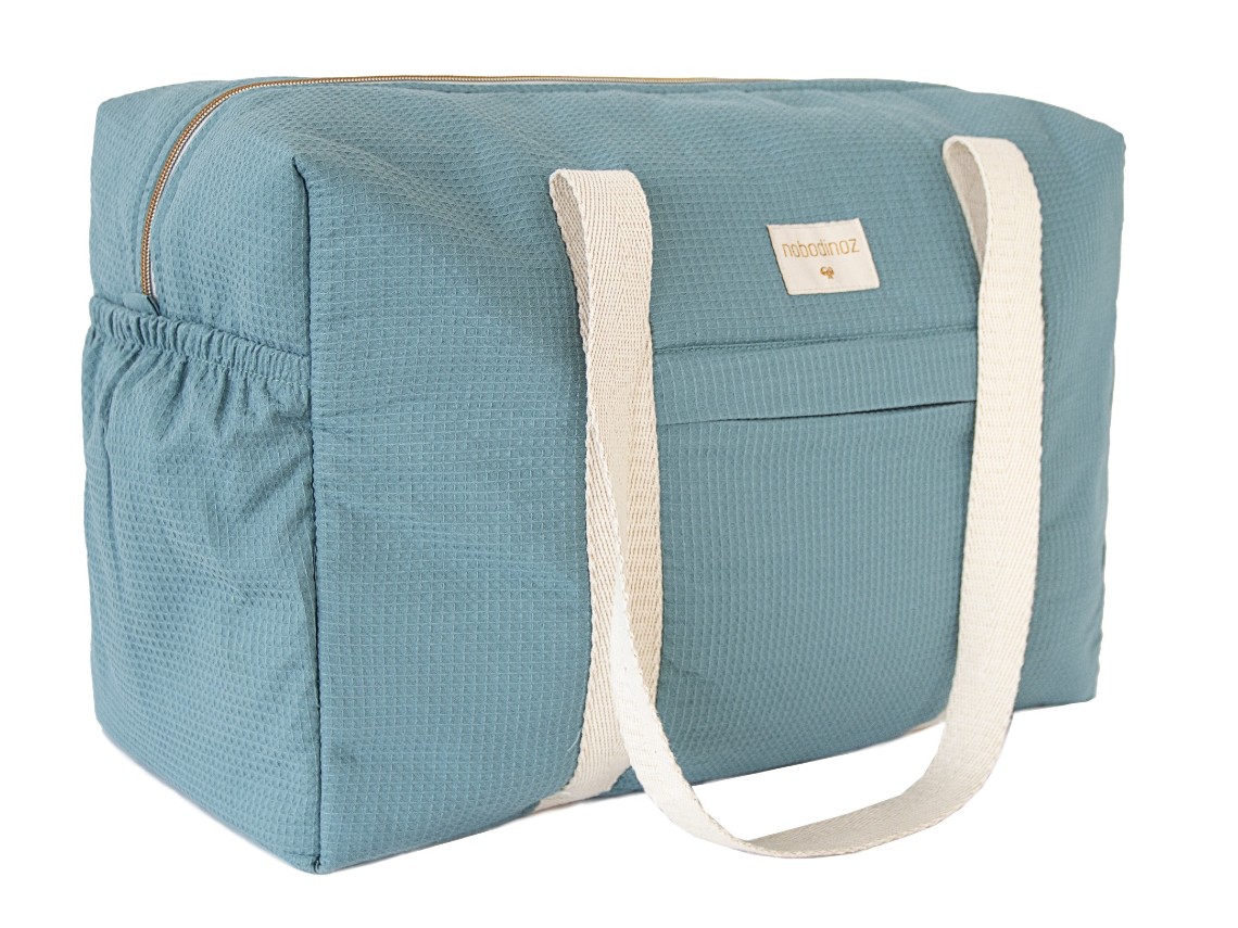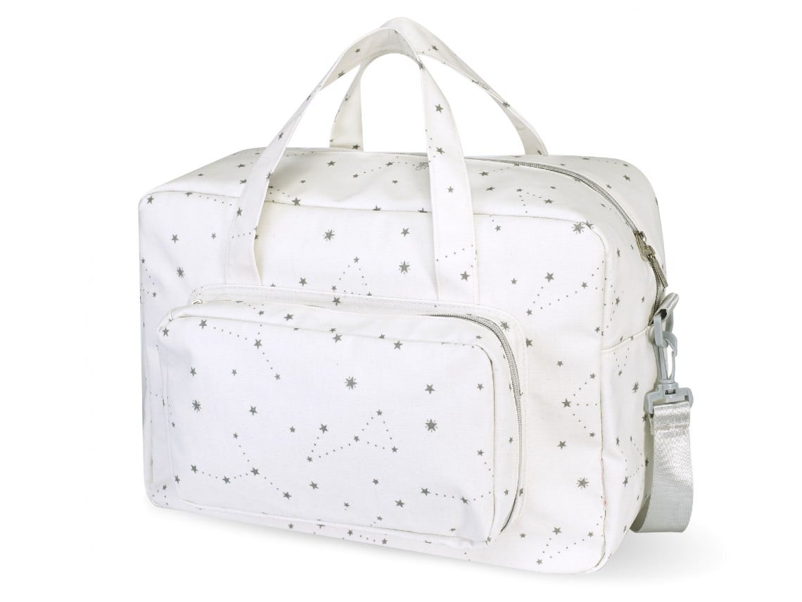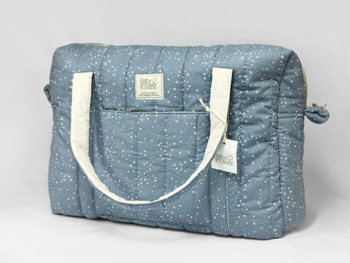 Bolsa de maternidad en color azul con un suave estampado en tonos blancos.Precio: 75 euros