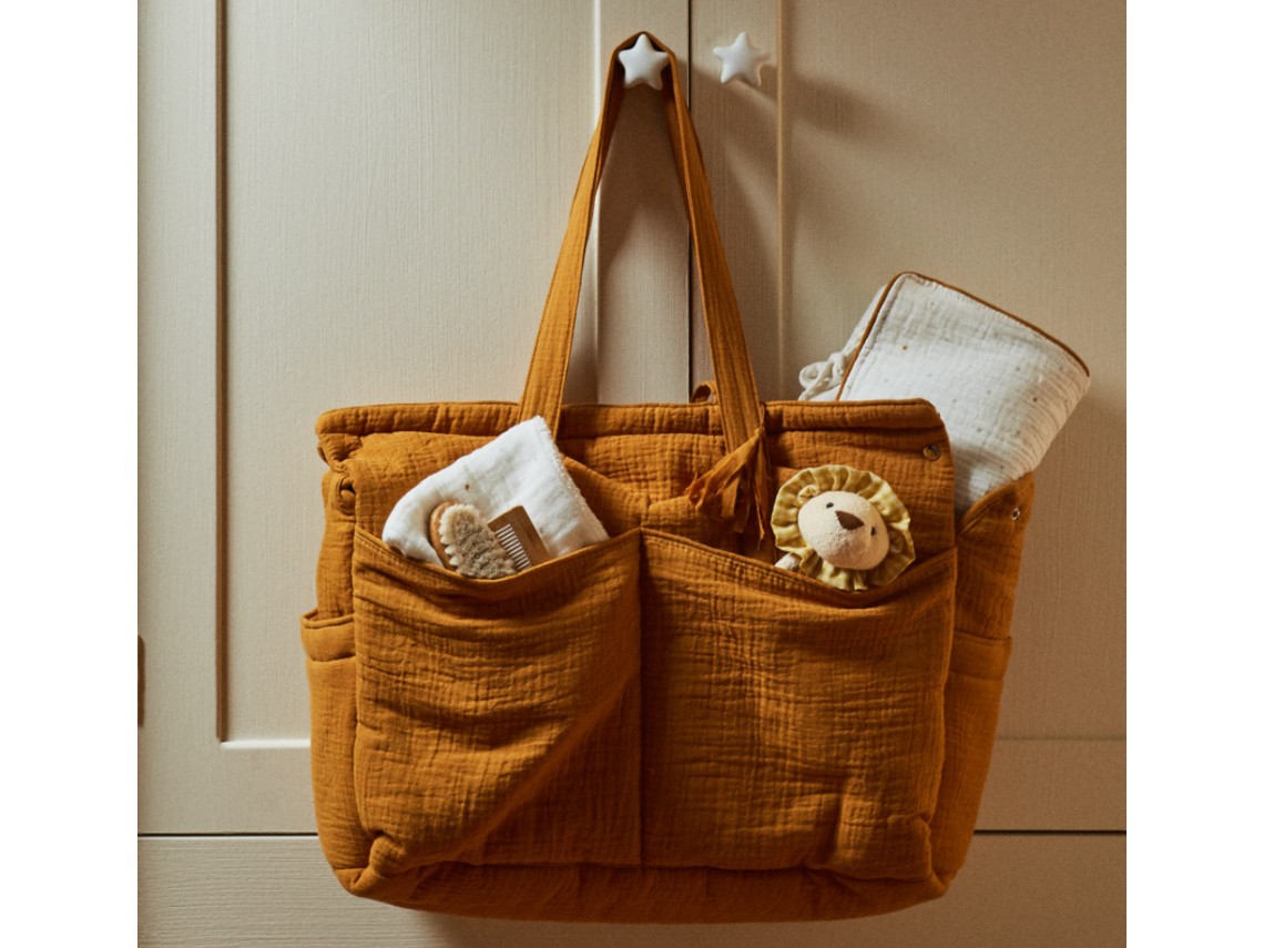Zara Home también tiene en su colección infantil bolsas de maternidad tan bonitas como esta de gasa en color mostaza. Precio: 35,99 euros