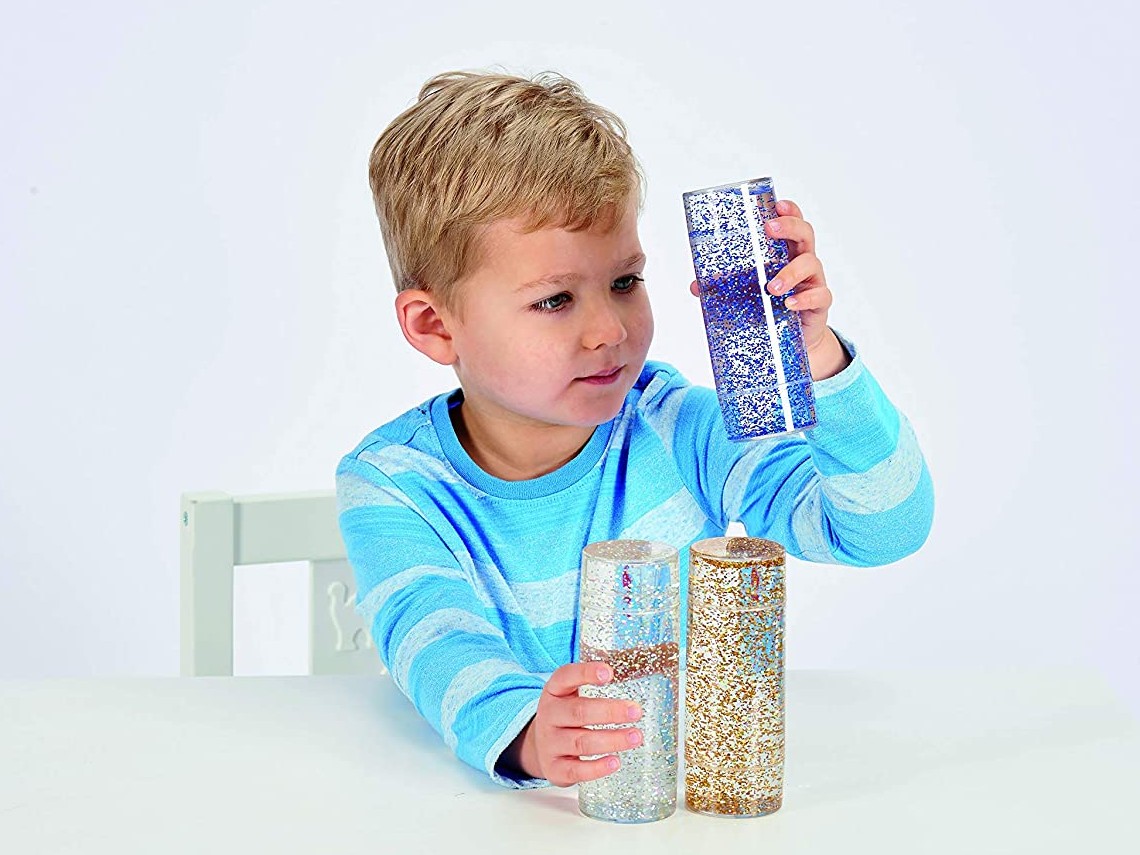 Conjunto de tres tubos sensoriales con purpurina interior que les ayudará a relajarse por ser fascinante para ellos ver cómo se mueven.