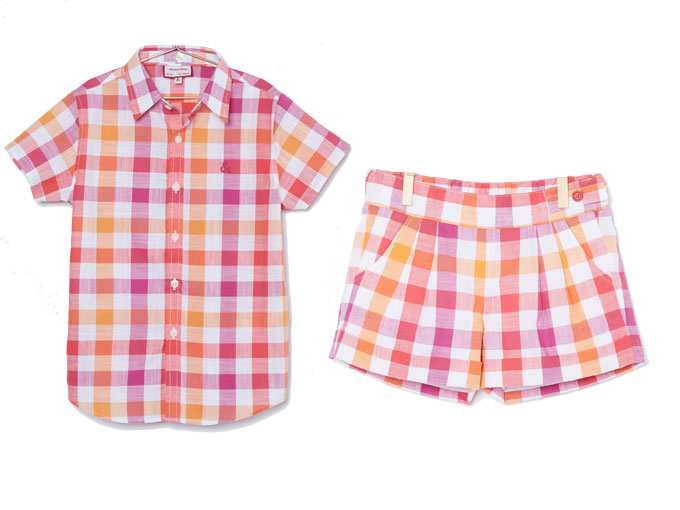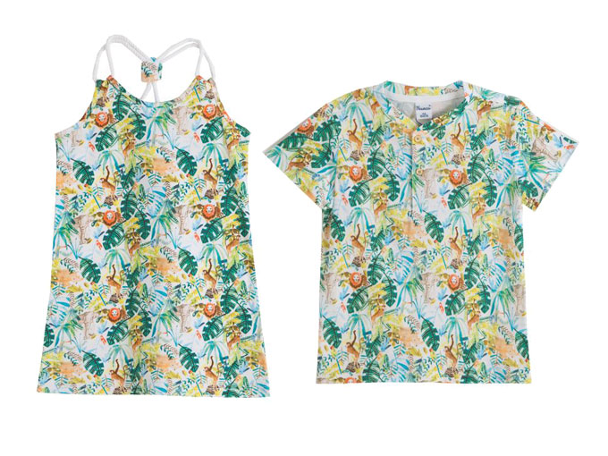 Un conjunto muy veraniego con el que irán perfectos. Suma unas bermudas lisas a la camisa para el niño y unas sandalias blancas al vestidito vaporoso.