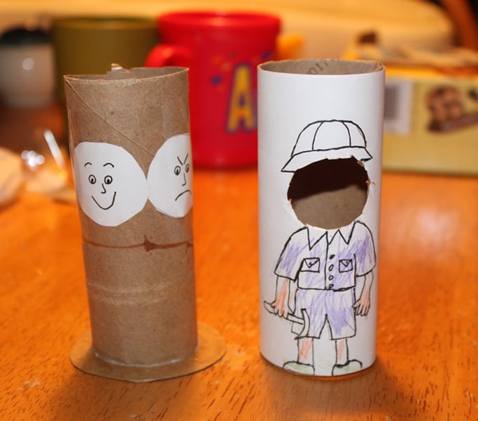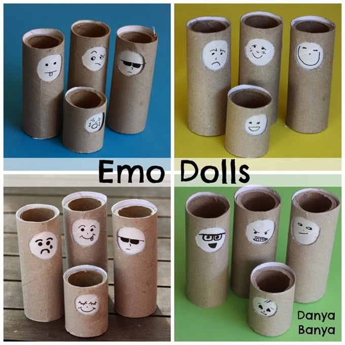 Tan sencillo como coger dos rollos de papel higiénico, recortar un círculo en uno de ellos, dibujar un pequeño hombrecito sin rostro y pegar en el otro caritas hechas con papel a la misma altura. Así irá aprendiendo a reconocer sus emociones.Fuente: http://frugalfun4boys.com