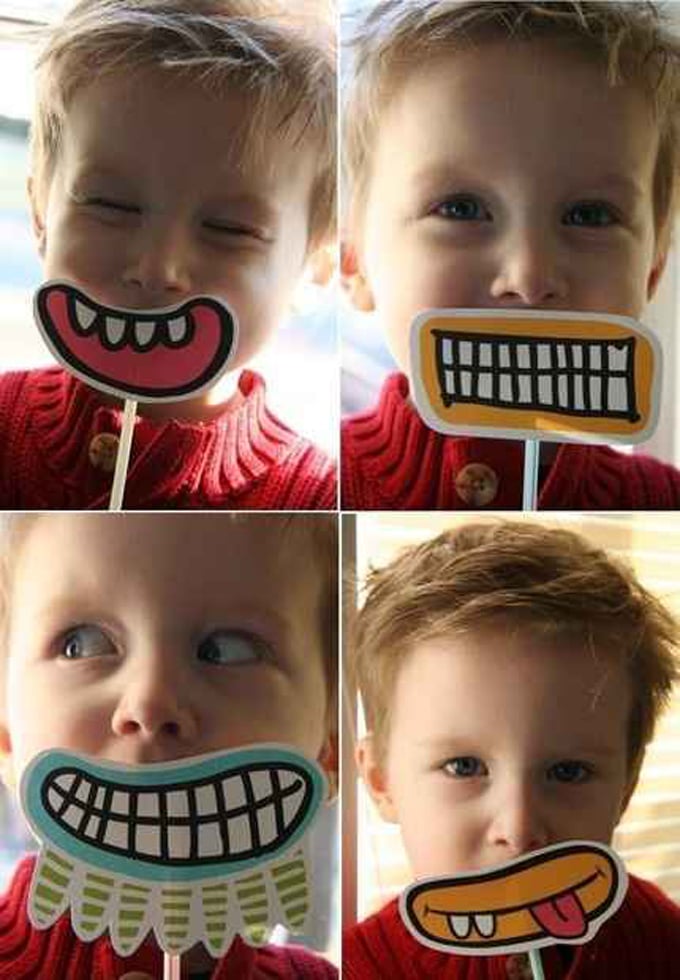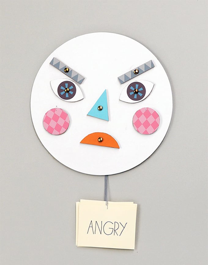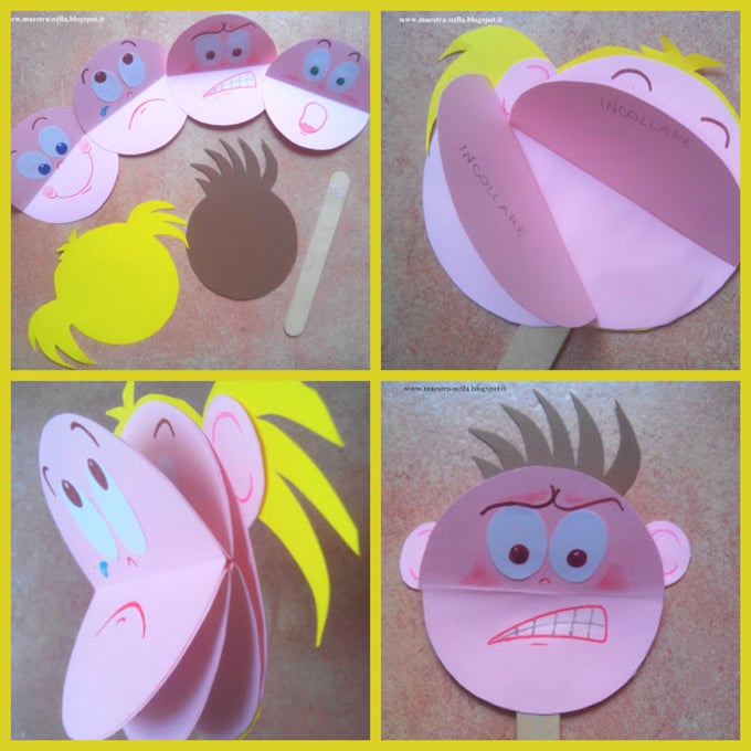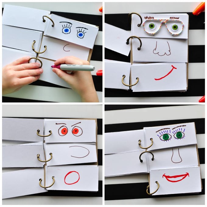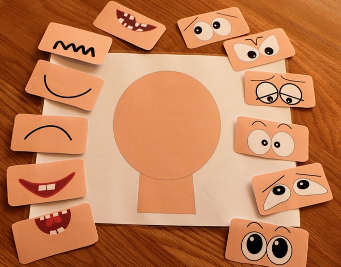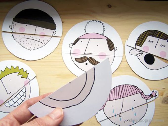 Corta caras con diferentes emociones en tres partes: ojos, nariz y boca. Haz dos agujeros en cada pieza y ponlas sobre un bloc. Ahora podrán jugar con ellas y crear diferentes expresiones.Fuente: http://iheartcraftythings.com
