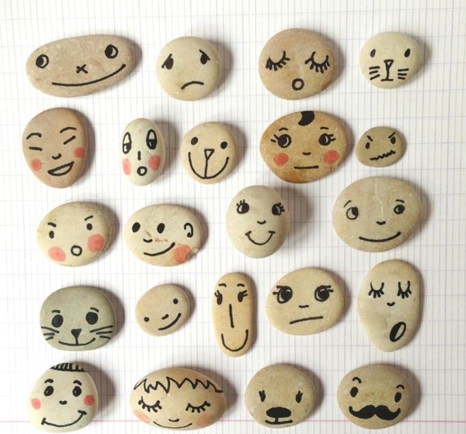Pintar caritas sobre piedras planas será un plan perfecto para enseñar al pequeño qué significan las emociones.Fuente: isabellekessedjian.blogspot.com