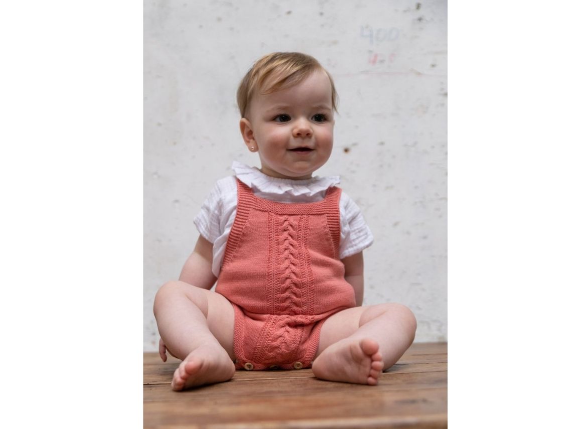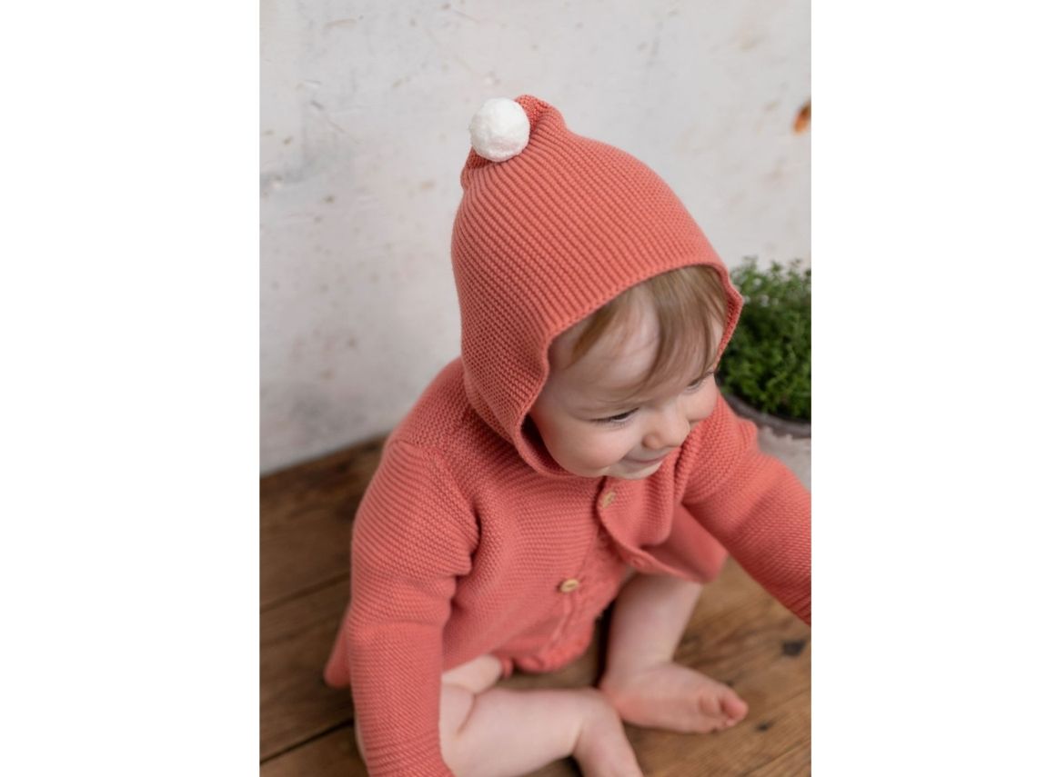 Para el fresco de las noches de verano, esta chaqueta coral en punto no puede ser más ideal. Lleva un gorrito con un pompón que le da el toque perfecto.
