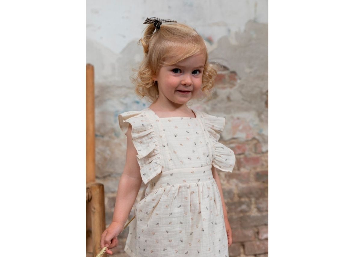 Una prenda versátil y vaporosa que evitará el calor del verano. Un vestido en blanco crudo con tirante con volante y estampado floral.