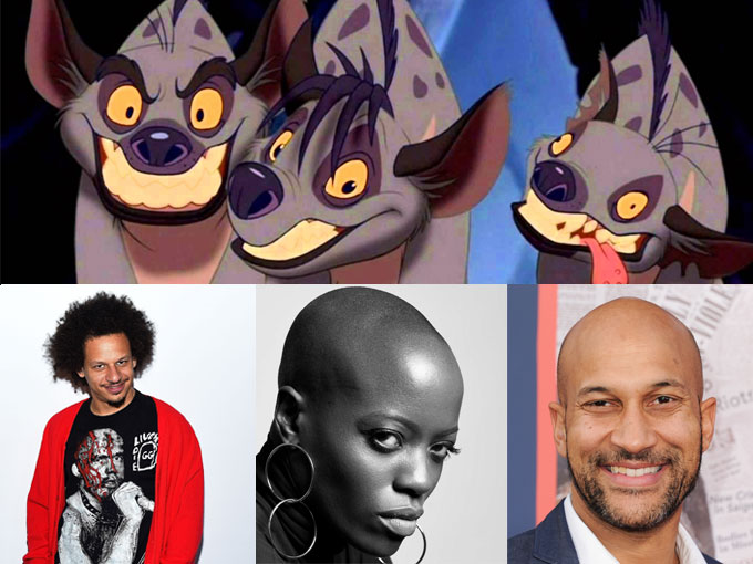 Las tres malvadas hienas, Azizi, Shenzi y Kamari, están interpretadas por Eric André, Florence Kasumba y Keegan-Michael Key.