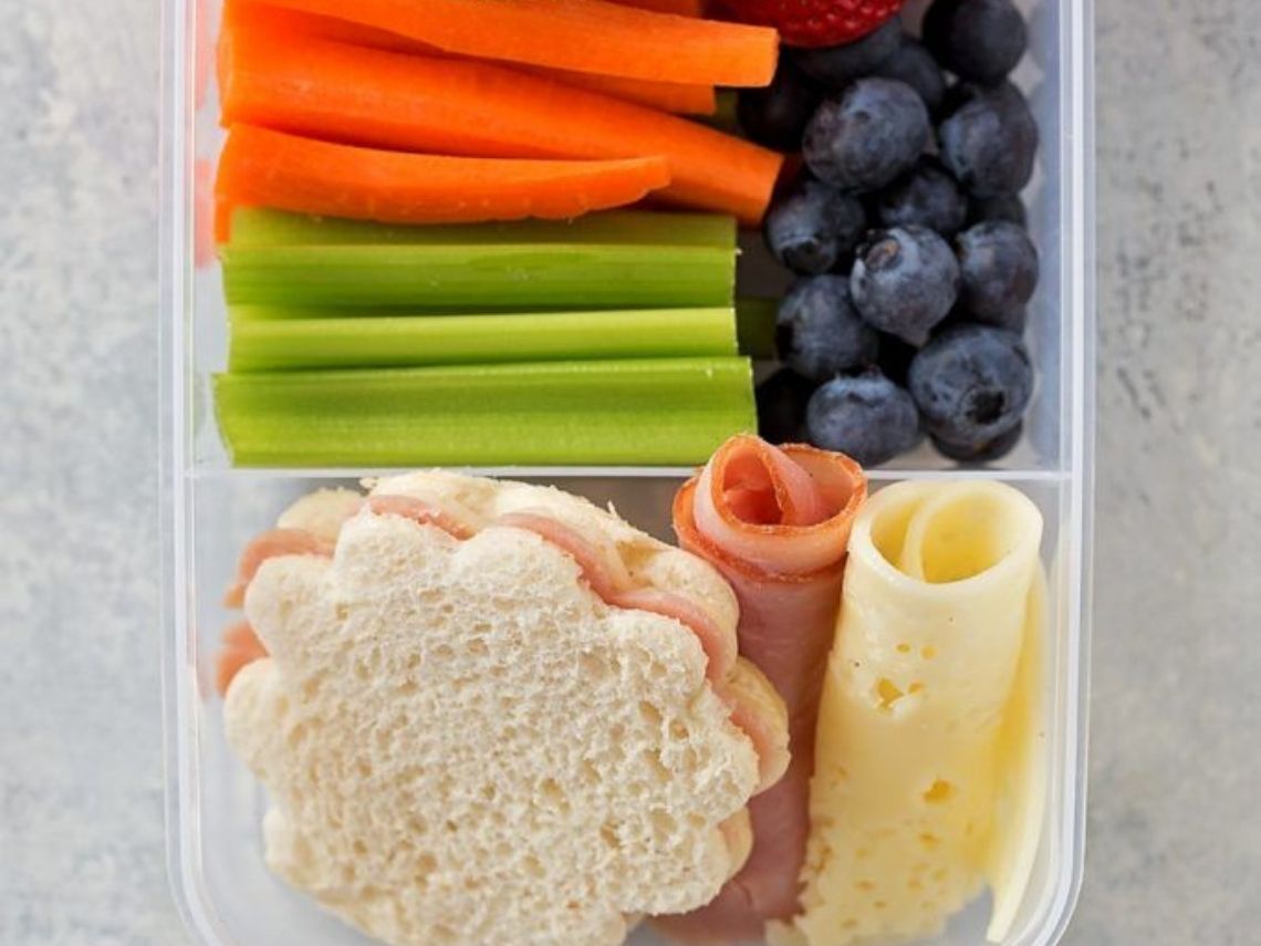 Este tupperware está lleno de alimentos variados como el pan, stick de verduras, verduras y frutas cortadas. Y si las hacemos de esta forma seguro que no querrán irse del parque sin comer.