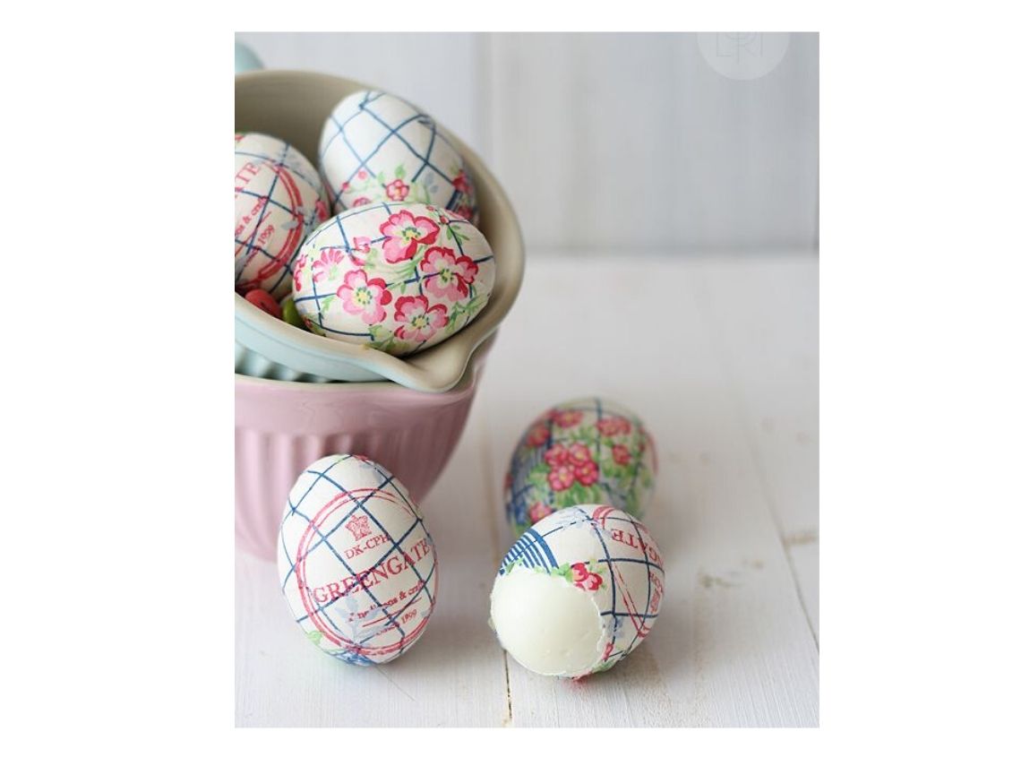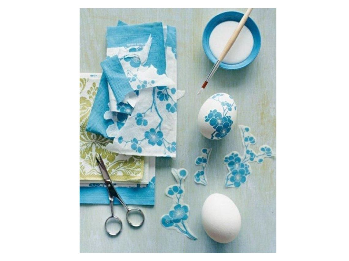¡Fácil de hacer con niños! Cocéis unos huevos. Elejis los dibujos de servilletas de papel y los recortáis. Pegáis con cuidado y utilizando vuestro buen gusto el dibujo en los huevos. Los podéis colocar en una cestita de mimbre encima de la mesa.