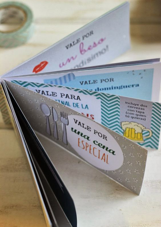 Deja que tu niño piense cuántas cosas le gustaría regalar a papá (una cena, una tarde de fútbol con él, un paseo, horas para jugar juntos, etc.) y apuntadlo todo en un supertalonario hecho con recortes patchwork. Fuente: littlevigo.com