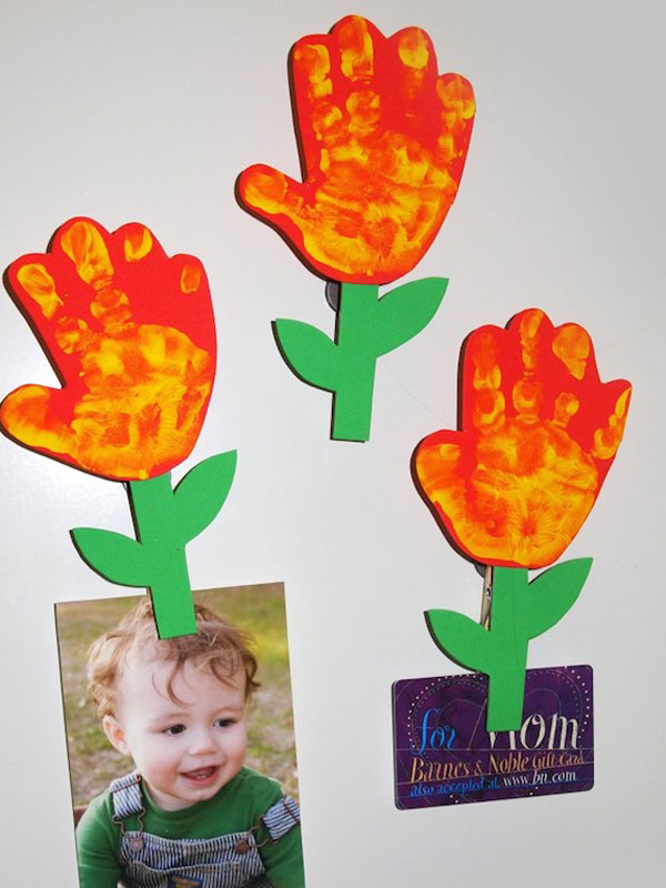 Déjales que pongan sus manitas sobre un trozo de escayola y pintadlo con colores. Pon un imán por detrás con un poco de pegamento y será perfecto para sujetar las fotos más bonitas en la puerta de la nevera.
