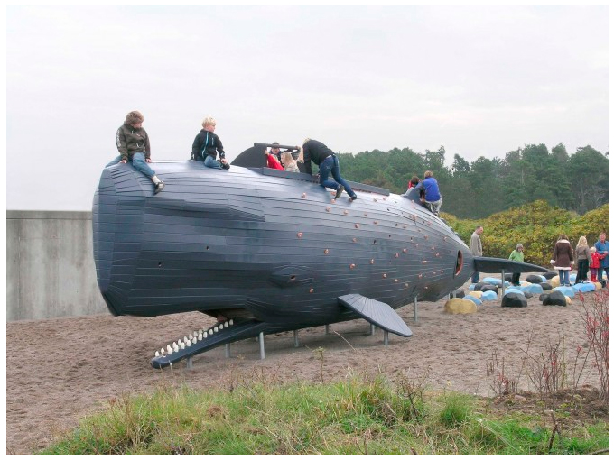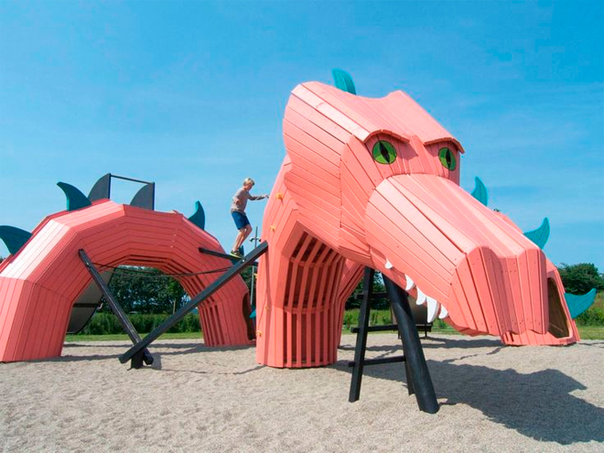El parque infantil Dragon, Mulighedernes Park, Aalborg (Dinamarca) dispone de puntos de escalada por todo el cuerpo, con recorridos fáciles y difíciles.