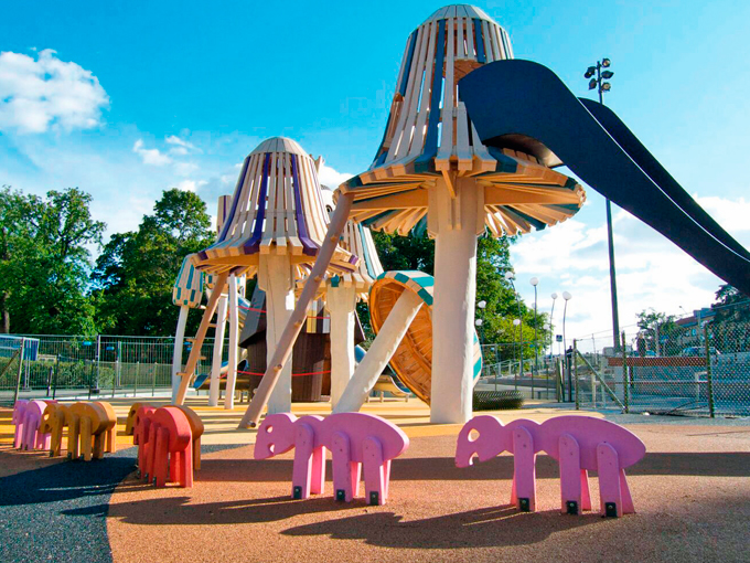 El parque infantil Kristinebergs Slottspark, Estocolmo (Suecia) junto a altísimos búhos de cinco metros de alto y grandes escarabajos, crecen hongos comunicados entre sí a diferentes alturas, una seta con carrusel...