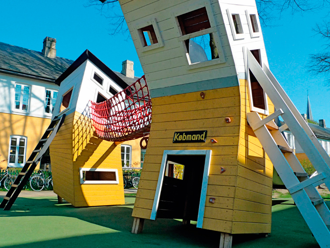 El parque infantil Crooked Houses, Copenhague (Dinamarca) es una zona de juegos que rememora el encanto del barrio de Brumleby de 1800. Todo está permitido: puntos de escalada, pasarelas entre las casas, balancines...