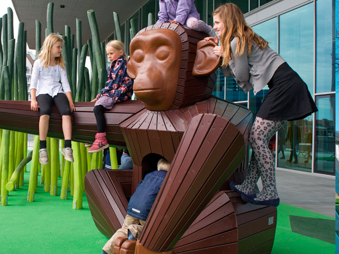 El parque Globe, Aarhus de Dinamarca dispone de 5 áreas de juego rodean la biblioteca. Basadas en historias sobre naturaleza, animales, paisajes, cultura...