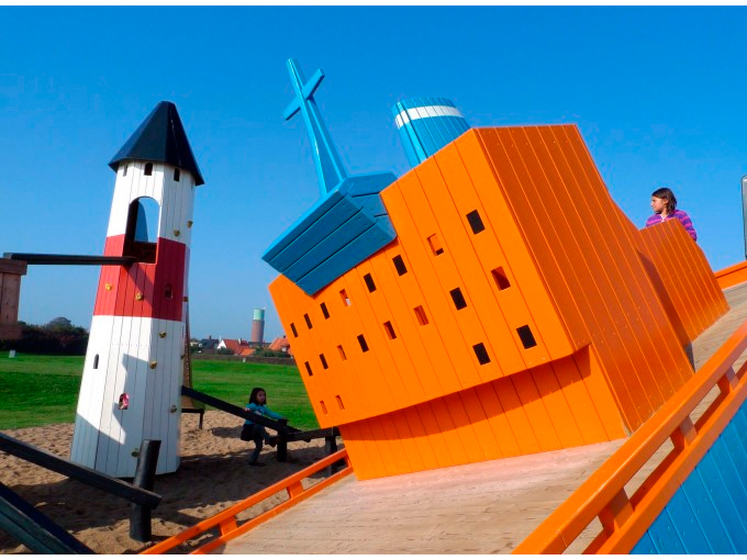 El parque infantil Trinidad-The Lost Coaster, Copenhague (Dinamarca) es un barco naufragado en un banco de arena y se rompe en dos. ¡Hay que aferrarse a la cubierta para no resbalar y caer al agua!