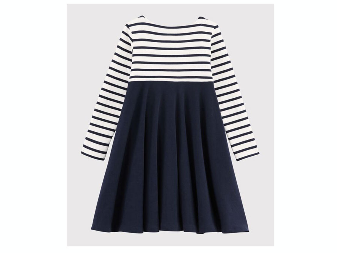 Este vestido es lo más sencillo del mundo pero también muy elegante, un básico al que muchos recurrimos en invierno. Junto a un par de leotardos para apaciguar el fresquito, lo encontramos en Petit Bateau.