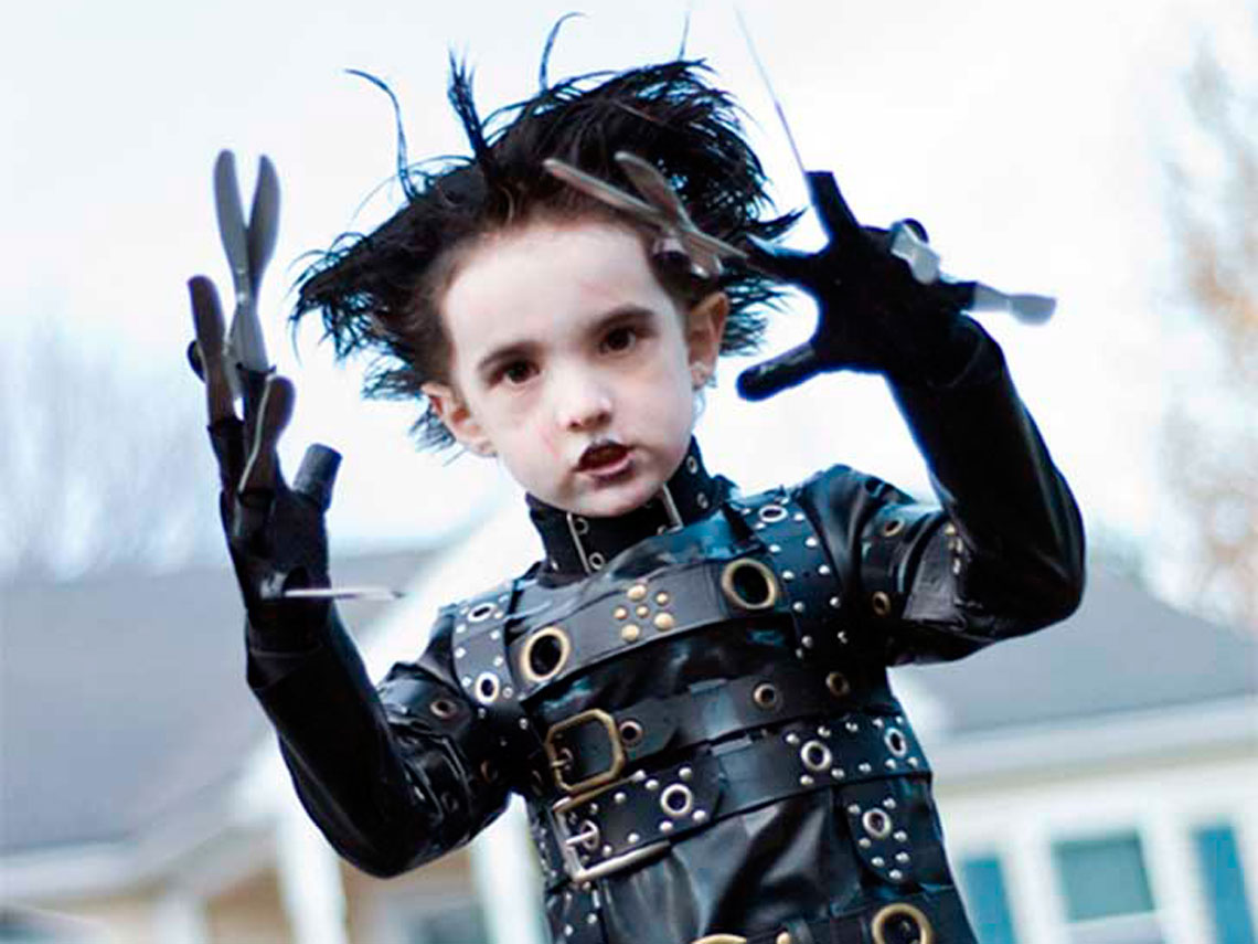 Puedes convertir a tu peque en un hombre tijera cosiendo a unos guantes palitos que no pinchen, pero que imiten a los cuchillos y confeccionando un traje de cuero al que no le falten unos cuantos cinturones con tachuelas.